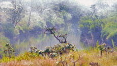 抵達(dá)努瓦埃利亞后,旅館經(jīng)理幫我們預(yù)約了第二天一早接我們?nèi)セ魻栴D平原國(guó)家公園的汽車。早上五點(diǎn)半我們的汽車出發(fā)了。小城還在沉睡中,山路上汽車尾燈閃爍,沒人按喇叭,一輛接著一輛快速行駛著。東邊露出魚肚白,云層重重疊疊,深深淺淺,猶如水墨畫一般。慢慢地遠(yuǎn)處透出朝陽的光輝,高高的棕櫚樹的剪影如衛(wèi)士一般?斓焦珗@門口處,車停下來讓大家拍照。群山寧靜安詳,晨霧飄飄然,山嵐重疊。遠(yuǎn)處漸漸變亮,山路上的風(fēng)能發(fā)電裝置高高的桿子清晰起來。近處的棕櫚樹披上金色陽光,眼前小草、小花上晶瑩欲滴的露水反光強(qiáng)烈。眼前每一分鐘景色都不同,相機(jī)的快門聲響成一片。