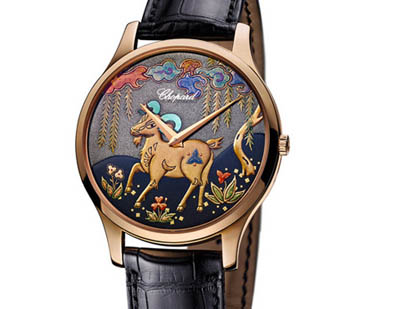 XP腕表。十二生肖中藝術(shù)性最高的山羊造型在面盤(pán)上精致呈現(xiàn),表殼內(nèi)更搭載蕭邦自制的L.U.C超薄機(jī)芯。
