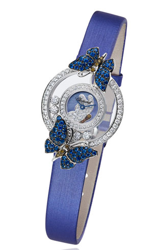 Diamonds系列以飛舞的蝴蝶為造型,打造出一款全新的珠寶腕表。其扣人心弦的外觀設(shè)計(jì),加上精巧細(xì)膩的制作工藝,營(yíng)造出柔美動(dòng)人的女性氣質(zhì)。以浮雕形式呈現(xiàn)的兩只蝴蝶,周身鋪鑲藍(lán)寶石和棕色鉆石,它們停靠在Happy
