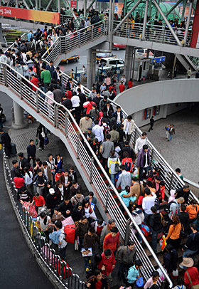攝 |  “取消‘五一長假’弊端的一次集中體現(xiàn)”   根據(jù)全國“假日辦”公布的黃金周“旅游信息通報”統(tǒng)計,今年全國各熱點旅游地區(qū)的游客接待量,同比上升均達(dá)到30%左右。黃金周首日,北京市客運量超過2000萬人次,同比增加26.5%,“鳥巢”、前門大街等熱門景點,都曾出現(xiàn)日接待游客30萬人次以上的高峰。云南麗江、山西平遙等地出現(xiàn)游客投宿無門、“一床難求”的緊缺狀況。