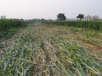 科收來(lái)臨之際,西安市郭杜鎮(zhèn)郭南村的數(shù)百畝玉米田日前遭到不明大型車輛“橫沖直撞”,百余畝即將成熟的玉米被碾毀。郭杜鎮(zhèn)因毗鄰某開(kāi)發(fā)區(qū),近年來(lái)因農(nóng)村土地征用問(wèn)題引發(fā)糾紛。本報(bào)記者馮國(guó)