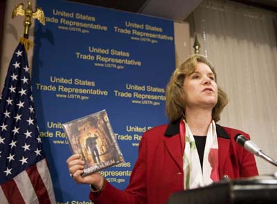 2007年4月9日,美國(guó)貿(mào)易代表蘇珊·施瓦布在華盛頓舉行的新聞發(fā)布會(huì)上展示一張電影《博物館之夜》的盜版DVD。當(dāng)天,蘇珊·施瓦布宣布,美國(guó)政府向世界貿(mào)易組織提出了針對(duì)中國(guó)的兩項(xiàng)貿(mào)易訴訟,分別指責(zé)中國(guó)打擊盜版不力和限制美國(guó)電影、音樂(lè)和圖書(shū)產(chǎn)品進(jìn)入本國(guó)市場(chǎng)。新華社/法新 |