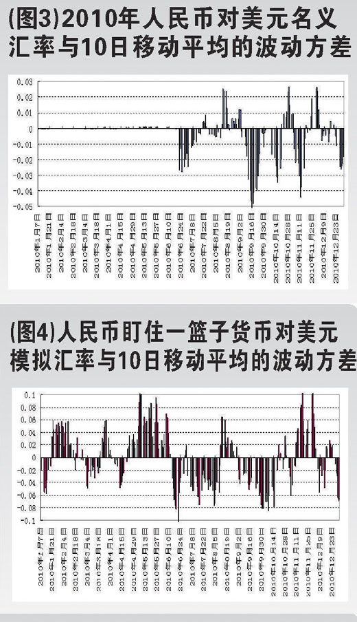 這是重啟匯改增強(qiáng)人民幣匯率彈性的結(jié)果。圖3和圖4分別顯示了2010年人民幣對(duì)美元匯率模擬值與實(shí)際值與其10日移動(dòng)平均線的波動(dòng)方差。從中可見(jiàn),匯改之前人民幣兌美元匯率基本沒(méi)有波動(dòng),匯改以后,波動(dòng)幅度明顯加大,但與盯住一籃子貨幣模擬匯率比較,其波動(dòng)幅度仍然偏小,其平均方差僅0.00385,而后者為0.0242。而且人民幣兌美元匯率波動(dòng)存在較明顯的偏向,向下波動(dòng)較大,而向上波動(dòng)太小。因此,進(jìn)一步增強(qiáng)人民幣對(duì)美元匯率彈性,特別是雙向波動(dòng)幅度,不僅有利于增加熱錢(qián)炒作人民幣匯率的風(fēng)險(xiǎn),而且有利于減少人民幣有效匯率的波動(dòng),降低其對(duì)進(jìn)出口貿(mào)易的不利影響。
