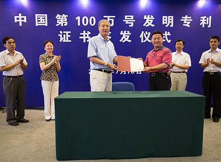 7月16日,國家知識產(chǎn)權(quán)局局長田力普(左三)向發(fā)明專利權(quán)利人北京農(nóng)業(yè)信息技術(shù)研究中心的負(fù)責(zé)人頒發(fā)證書。此次簽發(fā)的第100萬號授權(quán)發(fā)明專利名稱為“一種虛擬玉米葉片模型可控面元劃分方法”。自1985年授權(quán)首件發(fā)明專利以來,至今年7月11日,我國27年時間里發(fā)明專利累計授權(quán)量達(dá)到100萬件,成為世界上達(dá)到這個目標(biāo)耗時最短的國家。但是,我們的專利擁有總量、國民人均擁有量、專利轉(zhuǎn)化率,還遠(yuǎn)遠(yuǎn)落后于許多領(lǐng)先的創(chuàng)新性國家。記者 金立旺 攝 |