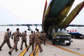 北京南苑機(jī)場,救援人員準(zhǔn)備登上大型運(yùn)輸機(jī)。新華社發(fā)(沈玲 攝) |