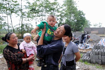5月10日,黃長(zhǎng)容、王興林夫婦和他們地震后降生的兒子王俊杰與鄰家的小妹妹在一起。他的兒子和這個(gè)小女孩都是“再生育全程服務(wù)行動(dòng)”下出生的“地震寶寶”。新華社記者