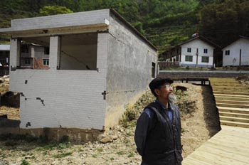 2010年4月30日,80歲的楊林生老人遙望遠(yuǎn)方,他身后右側(cè)是地震被毀壞的房子(如今已經(jīng)納入東河口地震遺址保護(hù)范圍),左側(cè)是重建的三間木結(jié)構(gòu)新房。 |