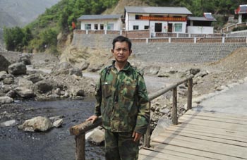 2010年4月30日,站在新家園前的何清躍。 | 2008年5月12日,一場(chǎng)突如其來的災(zāi)難改變了他們?cè)瓉砥届o的生活,頃刻之間山崩地裂,房倒屋塌,家園盡毀,痛失親人…… 2010年5月12日,經(jīng)過兩年的恢復(fù)重建,他們的生活又重新歸于平靜,住房重建,心理恢復(fù),憧憬未來…… 在汶川特大地震發(fā)生的兩年之后,記者重新踏上這片曾滿目瘡痍的土地,在小橋流水、亭臺(tái)綠樹之間,傾聽他們?cè)V說這兩年發(fā)生的故事——