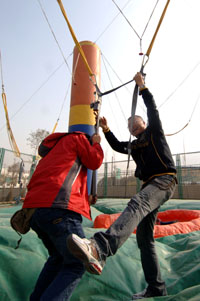 11月9日,一名游客準(zhǔn)備在位于青海省西寧市寧湖湖畔的寧湖民族體育文化旅游園內(nèi)玩蹦極。