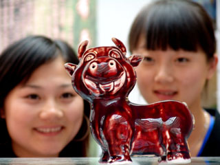 兩名參觀者在景德鎮(zhèn)中國陶瓷博物館被顏色釉生肖牛瓷雕《咪咪牛》所吸引。新華社發(fā)(石衛(wèi)明