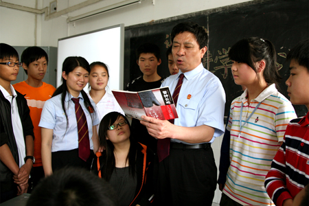 六·一國(guó)際兒童節(jié)前,江蘇省無(wú)錫市北塘區(qū)法院少年審判庭庭長(zhǎng)楊建忠、書記員周靜來(lái)到無(wú)錫市山明中學(xué)。面對(duì)學(xué)生不斷提出的問(wèn)題,結(jié)合《警鐘長(zhǎng)鳴人更醒》一書,以案說(shuō)法,受到了學(xué)生的廣泛歡迎。