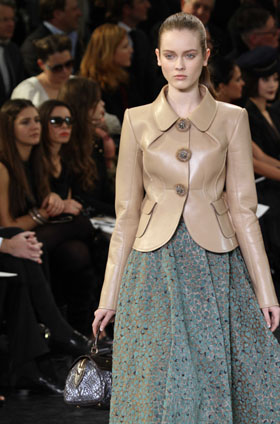 | 新華社/西霸 |    巴黎   路易威登:高舉復(fù)古大旗“閃回”過去   路易威登這一季舉起復(fù)古大旗,“閃回”過去,再現(xiàn)上世紀50年代女性的風(fēng)姿。由著名設(shè)計師馬克·雅各布斯主理的路易威登2010—2011秋冬時裝以連衣長裙為主。各式花色裙裝均采用收腰設(shè)計,而裙擺處則采用開放式設(shè)計,仿佛一朵朵鮮花在模特身上綻放。此外,設(shè)計師在長裙上身部分的精心設(shè)計,突出了女性的豐滿、盈潤。