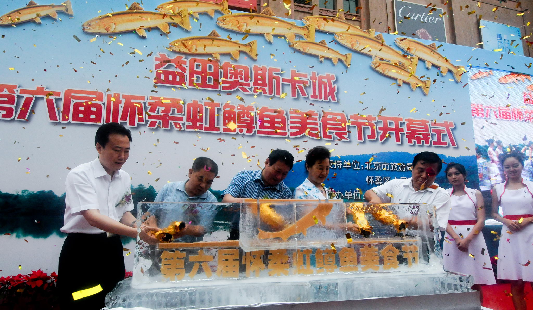 2010年7月13日,在北京王府井大街舉辦的懷柔區(qū)第六屆虹鱒魚美食節(jié)開幕式上,嘉賓將酒注入冰塊中。據(jù)介紹,本屆虹鱒魚美食節(jié)以“相約生態(tài)懷柔,共享虹鱒盛宴”為主題,共有17項(xiàng)活動(dòng)將陸續(xù)推出。