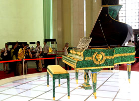 由民政部、中國(guó)社會(huì)工作協(xié)會(huì)等主辦的首屆“全國(guó)民間文化藝術(shù)精品上海公益博覽周”日前在上海展覽中心開(kāi)幕。曾被美國(guó)流行音樂(lè)天王邁克爾·杰克遜珍藏的孔雀石鋼琴等500多件珍貴展品將在這里公開(kāi)展出7天,并于7月31日進(jìn)行公益拍賣。 這架鋼琴被主辦方放置在展覽中心一層中央大廳的正中間位置。琴身主體材料為孔雀石,并用大量黃金、珠寶作裝飾,整琴重達(dá)639公斤,極為奢華。這架鋼琴有130多年的歷史,原為俄國(guó)皇室所有,后輾轉(zhuǎn)被多名世界樂(lè)壇名流收藏,其中就包括邁克爾·杰克遜。 據(jù)介紹,本次公益拍賣會(huì)共匯集了包括鉆石珠寶、名家畫(huà)作、名貴家具等在內(nèi)的500多件來(lái)自于民間的藝術(shù)精品,拍品總估價(jià)30多億元。主辦方將于7月31日在上海展覽中心舉行義拍,所籌善款全部用于革命老區(qū)貧困家庭兒童的助醫(yī)行動(dòng)和青海省扶貧工程。