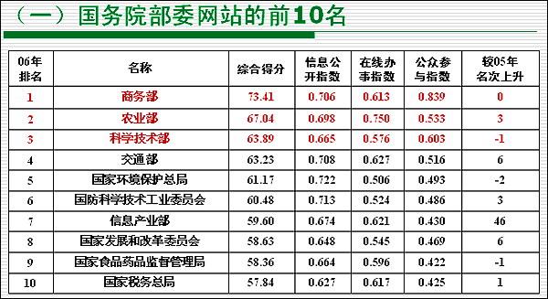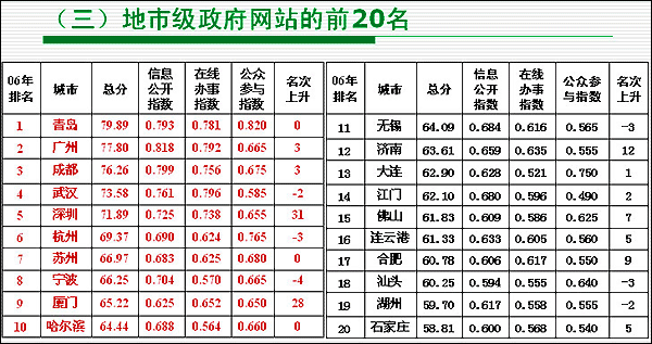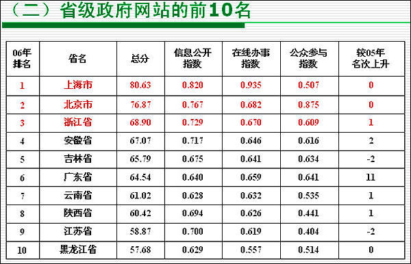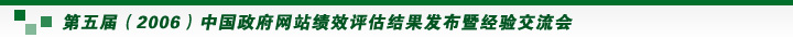 | 2007年1月11日上午9時(shí),由國務(wù)院信息化工作辦公室主辦,中國電子信息產(chǎn)業(yè)發(fā)展研究院承辦的“第五屆(2006)中國政府網(wǎng)站績效評估結(jié)果發(fā)布暨經(jīng)驗(yàn)交流會(huì)”在北京召開。國務(wù)院各部門、省級政府、副省級政府、地市級及縣級政府約550人參會(huì)。