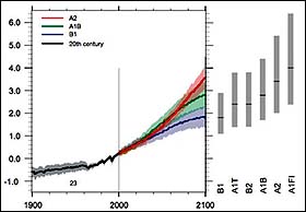 《氣候變化2007:科學(xué)基礎(chǔ)》中的氣溫上升示意圖。A1為高經(jīng)濟(jì)發(fā)展情景,人口得到控制。此情景包括:大量使用化石燃料(A1FI)、不使用化石燃料(A1T)、能源種類平衡發(fā)展(A1B)。A2是低經(jīng)濟(jì)增長(zhǎng)情景,人口持續(xù)增長(zhǎng)。B1假定各國對(duì)環(huán)境保護(hù)形成共識(shí),走向可持續(xù)發(fā)展道路。B2同B1類似,但強(qiáng)調(diào)區(qū)域的發(fā)展。人口增長(zhǎng)處于中間水平。圖表右側(cè)表示氣溫上升幅度。