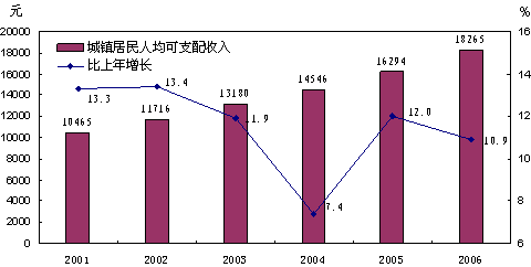 圖3    2001-2006浙江省城鎮(zhèn)居民收入及其增長(zhǎng)速度