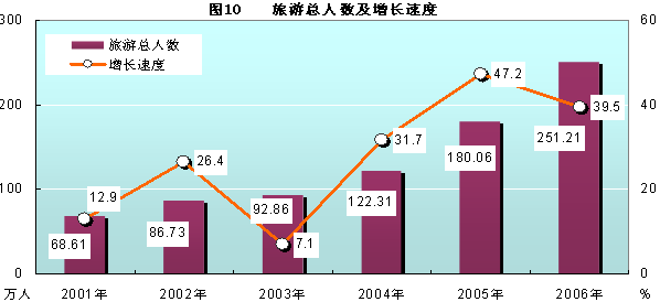 全年接待國(guó)內(nèi)外旅游者251.21萬(wàn)人次,比上年增長(zhǎng)39.5%。其中:接待國(guó)內(nèi)旅游者235.73萬(wàn)人次,增長(zhǎng)40.4%;接待海外旅游人數(shù)15.48萬(wàn)人次,增長(zhǎng)27.6%。全年實(shí)現(xiàn)旅游總收入27.71億元,比上年增長(zhǎng)43.2%。實(shí)現(xiàn)外匯收入6094萬(wàn)美元,比上年增長(zhǎng)37.1%。