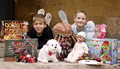 10月10日,英國玩具零售商協(xié)會前公布了該協(xié)會預(yù)測的2007年圣誕節(jié)12種熱門玩具。圖為在英國首都倫敦,兩名兒童和被選出的12種熱門玩具合影。