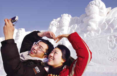 昨日(8日),2008中國(guó)沈陽國(guó)際冰雪節(jié)大型雪雕《雅典―北京》、《龍騰奧運(yùn)》等亮相沈陽棋盤山冰雪大世界。本屆冰雪節(jié)將于1月11日開幕。圖為游客在大型雪雕《龍騰奧運(yùn)》前合影留念。 新華社 發(fā)