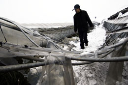 1月22日,安徽省舒城縣雙豐農(nóng)業(yè)科技示范園的工人在整理被大雪壓塌的大棚。連日來(lái),安徽部分地區(qū)持續(xù)降雪。大雪造成全省12個(gè)市受災(zāi),受災(zāi)人口300多萬(wàn)人,轉(zhuǎn)移安置4000多人,因?yàn)?zāi)死亡1人,因?yàn)?zāi)傷病14人。農(nóng)作物受災(zāi)面積200多萬(wàn)畝,倒塌房屋3600多間,直接經(jīng)濟(jì)損失4.3億元。新華社記者:李健 攝