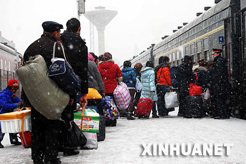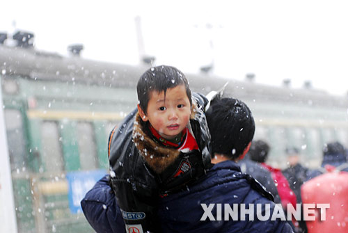 | 1月23日,外來務工人員冒雪在煙臺火車站登車。新華社發(fā) 申吉忠