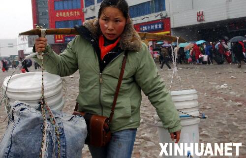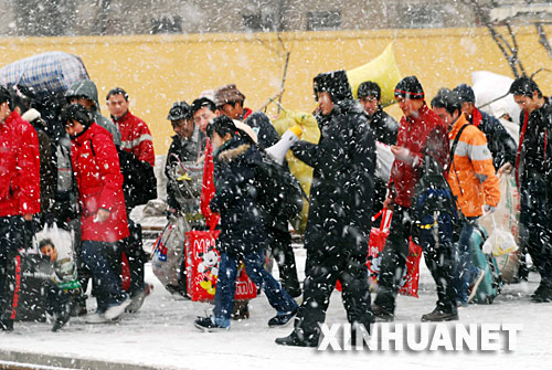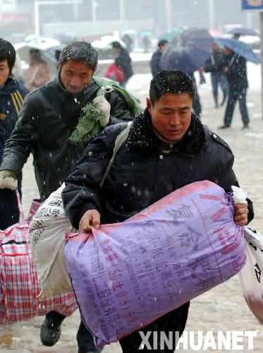| 1月19日,農民工準備從合肥火車站乘車回家。 當日,安徽大部分地區(qū)降中雪或雨夾雪,部分地區(qū)降大到暴雪,安徽省氣象臺已發(fā)出暴雪黃色預警信號。大雪給旅客出行帶來極大不便,合肥火車站已啟動應急預案,確保旅客乘車安全。新華社記者