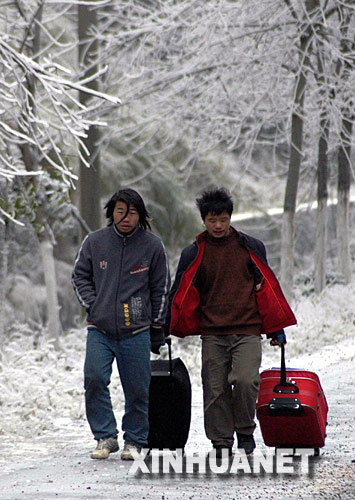 | 1月23日,從凱里中轉返鄉(xiāng)的旅客走在凝凍的路面上,準備步行幾十公里回家。 當日,貴州大部分地區(qū)的凝凍天氣仍在持續(xù)。省內主要公路干線均因凝凍天氣關閉,大量旅客選擇鐵路出行。從外省乘火車返鄉(xiāng)的部分旅客,因公路封閉無法轉乘汽車,不得已選擇步行回家。