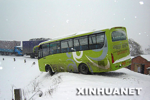 1月27日,一輛載客大客車由江蘇駛往安徽廬江,繞道行至巢湖市無為縣裕新路一彎道時(shí),因路面積雪濕滑,車輛失控險(xiǎn)些栽進(jìn)裕溪河,聞訊趕到的交警立即組織施救并將乘客安全轉(zhuǎn)運(yùn)。1月26日,安徽省巢湖市出現(xiàn)暴雪天氣,給人們出行帶來很大不便,道路交通受到影響。巢湖市氣象臺發(fā)布了暴雪和道路結(jié)冰橙色預(yù)警。 新華社發(fā)