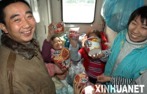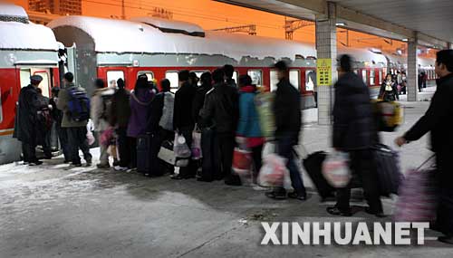 1月28日,在合肥火車站,旅客在排隊上車。 當(dāng)日凌晨3點,由合肥開往成都1432/1433次列車,因大雪晚點4小時后進(jìn)入站臺,記者隨旅客隊伍一起登上這趟列車,一線感受春運。開車后,各車廂列車員為旅客及時供應(yīng)開水,廣播員多次為列車晚點向旅客致歉,列車長和乘警走進(jìn)硬座車廂檢查“三品”。車廂外天寒地凍,車廂內(nèi)暖意融融。新華社記者 陶明 攝
