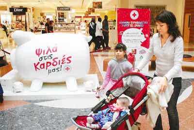 3月8日,人們走過塞浦路斯首都尼科西亞一個(gè)商場(chǎng)內(nèi)設(shè)立的超大豬形儲(chǔ)錢罐。當(dāng)日,當(dāng)?shù)乜駳g節(jié)進(jìn)入高潮,紅十字會(huì)借機(jī)推廣“零錢獻(xiàn)愛心”活動(dòng),呼吁民眾將家中零散的舊硬幣捐獻(xiàn)出來用于慈善事業(yè)。