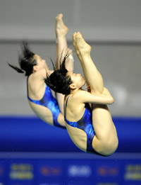 3月23日,郭晶晶(右)吳敏霞在安徽合肥舉行的2008年全國(guó)跳水冠軍賽暨奧運(yùn)會(huì)選拔賽(雙人)女子雙人3米板決賽中,以348.00分的成績(jī)奪得金牌。新華社記者:李健