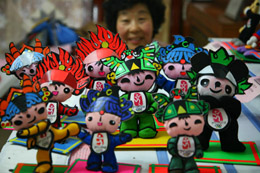 4月7日,北京市懷柔區(qū)的一名退休教師郭秀芳展示她親手制作的福娃。郭秀芳在業(yè)余時(shí)間用布料縫制了百余件北京奧運(yùn)會吉祥物福娃,送給社區(qū)居民,并在社區(qū)活動中展示。