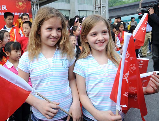 4月19日,百對雙胞胎“迎奧運、講文明、樹新風(fēng),爭做好市民從我做起”活動在天津舉行。圖為一對來自英國的8歲雙胞胎姐妹在活動上。