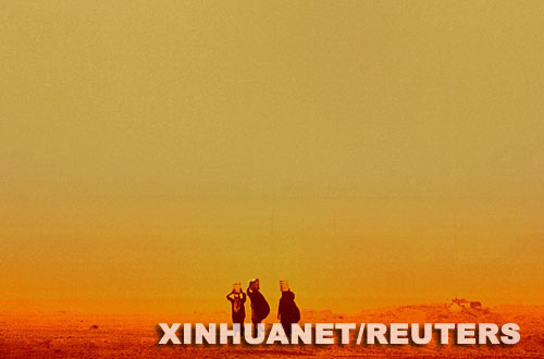 2003年4月16日,在伊拉克第二大城市巴士拉市郊,幾名伊拉克婦女頭頂水罐在沙塵暴中艱難前進。