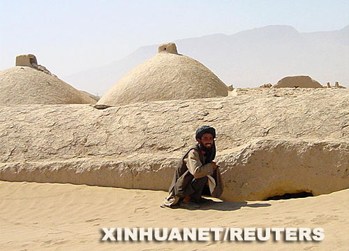 2002年8月11日,在馬扎里沙里夫附近的一個村莊,一名阿富汗男子守在幾乎被沙子埋沒的家門口(右側(cè)可見)旁。 新華社/路透 |