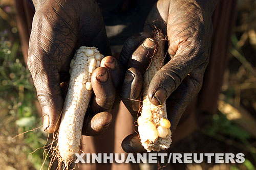 2002年5月25日,在距離馬拉維首都利隆圭30公里的一片農(nóng)田里,一名農(nóng)民展示因干旱幾乎絕收的玉米棒。