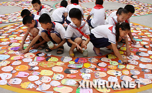 6月22日,學(xué)生們往奧運(yùn)五環(huán)里貼“笑臉”。