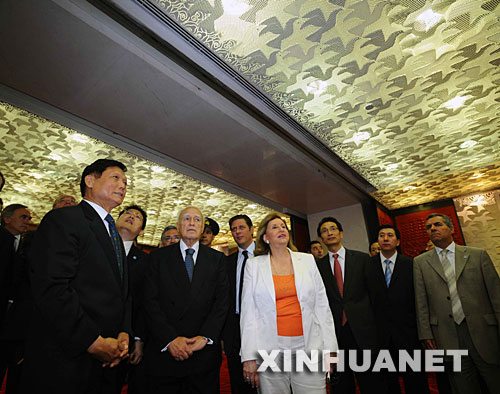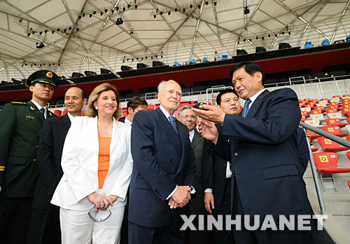 6月24日,正在中國進(jìn)行國事訪問的希臘總統(tǒng)帕普利亞斯在中共中央政治局委員、北京市委書記、北京奧組委主席劉淇的陪同下參觀國家體育場——“鳥巢”。