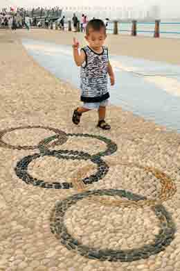 目前,青島處處充滿奧運氣息,廣大市民切身感受到了奧運就在自己身邊。健身步行道地面上的五環(huán)圖案引起了這位兒童的興趣。