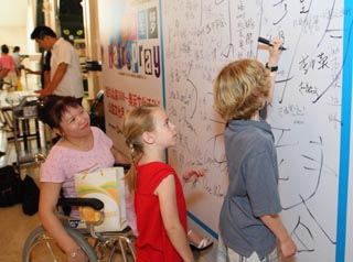 身著隊(duì)服的200名奧運(yùn)志愿者和來自中國殘聯(lián)、西城區(qū)殘聯(lián)的近300名殘障人士代表一同觀看了演出,F(xiàn)場觀眾們紛紛在演出現(xiàn)場的勵(lì)志留言板留言,祝福北京奧運(yùn)會(huì)圓滿成功,一批外國小觀眾也踴躍上前,寫下了“北京奧運(yùn)成功”的祝福語。