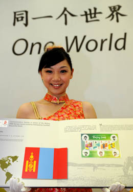 7月29日,一名禮儀小姐在展示蒙古國發(fā)行的奧運郵票。當(dāng)日,由中國集郵總公司發(fā)行的《第29屆奧林匹克運動會世界郵票大全》第三冊在廣州市亮相?偣菜膬缘脑撪]票大全收集了120多個國家和地區(qū)的500多枚郵票,目的是向全世界的集郵愛好者推介奧運文化。