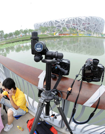 8月8日13時(shí)許,一名攝影師在國(guó)家體育場(chǎng)——“鳥巢”邊架起相機(jī)等待拍攝開幕式上燃放的煙花。此刻距北京奧運(yùn)會(huì)開幕還有不到7個(gè)小時(shí)。