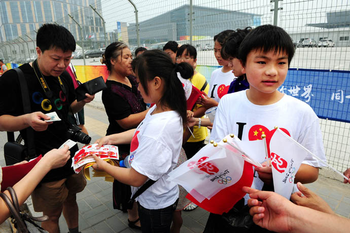 8月8日,人們在挑選旗幟。奧林匹克中心區(qū)附近張燈結(jié)彩、彩旗飄揚(yáng),來自海內(nèi)外的八方賓客歡聚一堂、喜迎奧運(yùn)。此刻距北京奧運(yùn)會開幕還有不到6個小時。