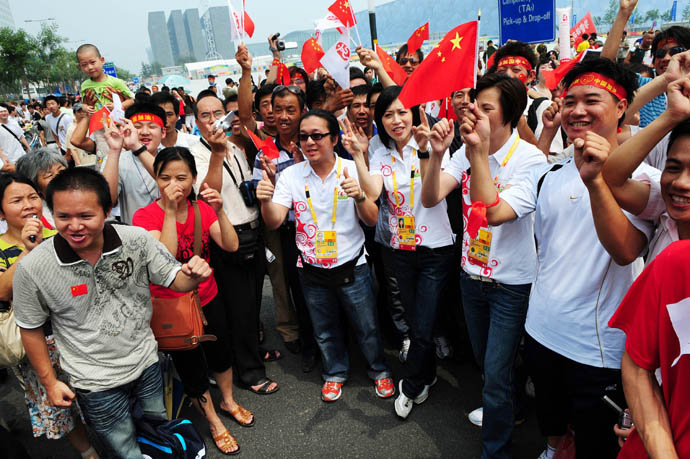 8月8日,許多人聚集在國家游泳中心——“水立方”外歡呼。奧林匹克中心區(qū)附近張燈結(jié)彩、彩旗飄揚,來自海內(nèi)外的八方賓客歡聚一堂、喜迎奧運。此刻距北京奧運會開幕還有不到6個小時。