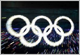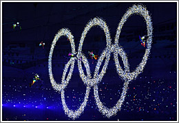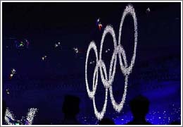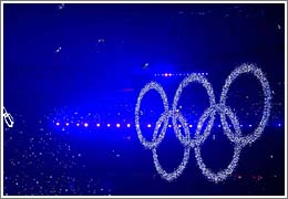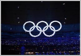 8月8日晚8時(shí),第29屆夏季奧林匹克運(yùn)動(dòng)會(huì)在國(guó)家體育場(chǎng)——“鳥巢”隆重開幕。這是開幕式上閃閃發(fā)光的夢(mèng)幻五環(huán)出現(xiàn)在“鳥巢”。