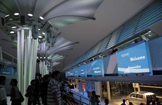 2008年8月9日,在文德恩教授致詞后,大眾汽車的奧林匹克主題館迎來了它的第一批嘉賓。這個(gè)與鳥巢遙相呼應(yīng),承載著大眾汽車奧運(yùn)夢想的開放式場館正式點(diǎn)燃了激情。 據(jù)大眾汽車集團(tuán)(中國)市場部總監(jiān)胡波先生介紹,這一主題館是15家贊助商主題場館中惟一的開放式建筑,一方面為了體現(xiàn)大眾汽車透明、開放的企業(yè)文化,另一方面也希望帶給參觀者更多與自然接觸的機(jī)會。雖然只是一個(gè)使用兩個(gè)月的臨時(shí)建筑,并且據(jù)大眾汽車估算,每一名參觀者只會在其中逗留15到20分鐘左右,但是大眾汽車卻專門請來德國設(shè)計(jì)事務(wù)所進(jìn)行設(shè)計(jì),并由一家駐上海的德國公司進(jìn)行施工。據(jù)胡波先生透露,這一次的投入幾乎與一次A級車展相同,但他同時(shí)表示,這一場館絕不會成為汽車展示廳,而是展現(xiàn)品牌、企業(yè)文化與奧林匹克精神相結(jié)合的一個(gè)舞臺。 胡波先生介紹說,在場館上方是戶外70米長的太陽能背景墻與9塊可移動式LED屏的結(jié)合運(yùn)用。在奧運(yùn)期間,主題館內(nèi)會進(jìn)行每場20分鐘左右的循環(huán)表演,不僅屏幕上會播出一些影片,而且會有特技演員與屏幕進(jìn)行互動式表演。在奧運(yùn)比賽的重要時(shí)刻大屏幕會進(jìn)行現(xiàn)場直播,讓每一名參觀者時(shí)刻感受著奧運(yùn)的氣息。