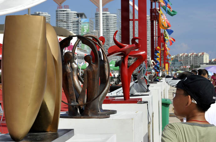 8月11日,奧運主題的雕塑作品吸引了一位小朋友的目光。