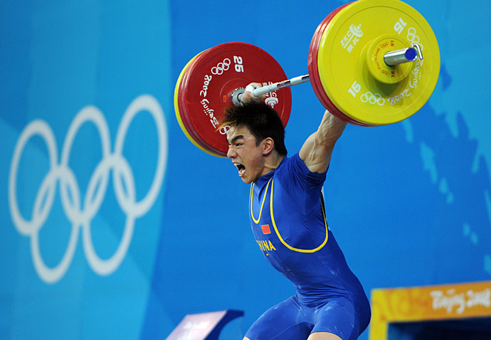 8月12日,中國選手廖輝在比賽中。當(dāng)日,廖輝在北京奧運(yùn)會舉重男子69公斤級決賽中以348公斤的總成績獲得金牌。