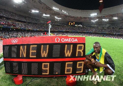 8月16日,牙買加選手尤塞恩·博爾特在比賽后與計時器合影。當日,博爾特在國家體育場“鳥巢”進行的北京奧運會男子100米決賽中以9秒69的成績奪得金牌并打破9秒72的世界紀錄。